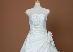 リボン部分はまるで大きなジュエリーを身に纏っているような印象。ミカド素材の上質さが引き立つAラインドレス。