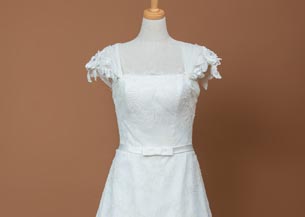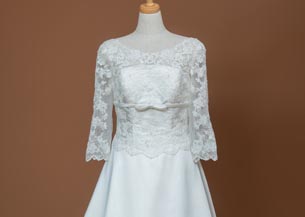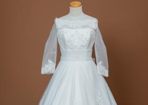 薄い生地に透かし模様の刺繍を施したレースがクラシカルで可愛い。シックで上品な印象を与えてくれる袖のあるプリンセスタイプ。