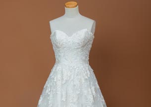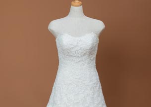 デコルテが綺麗に見えるハートカットのドレス。レースをふんだんに使用した大人の女性にふさわしい気品あふれる1着。