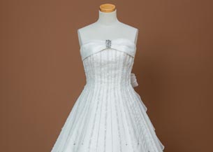 シンプルなデザインが女性らしさを際立たせる。ボリューム控えめクラシカルで正統派な印象にしたいという方にオススメの1着。