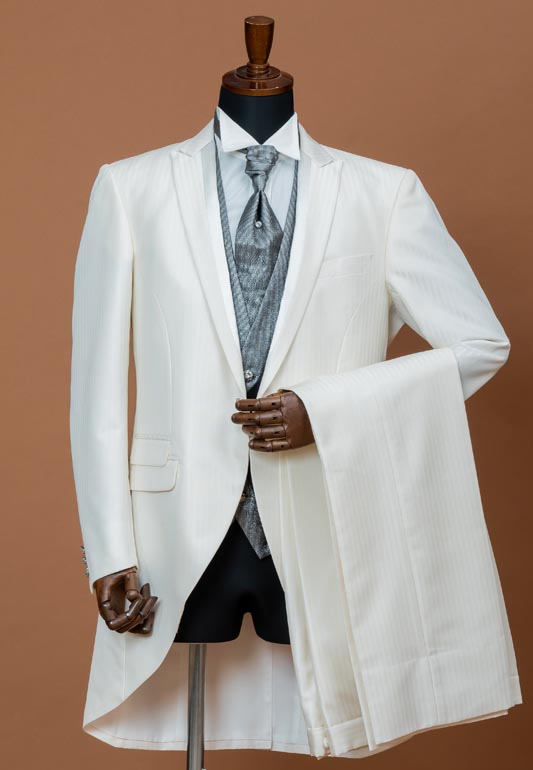 - ジャケットとパンツはホワイトをベースにアイボリーのストライプでシャープな印象。黒地にシルバーが光るベストがさらに引き締まった印象をプラスしてくれます。