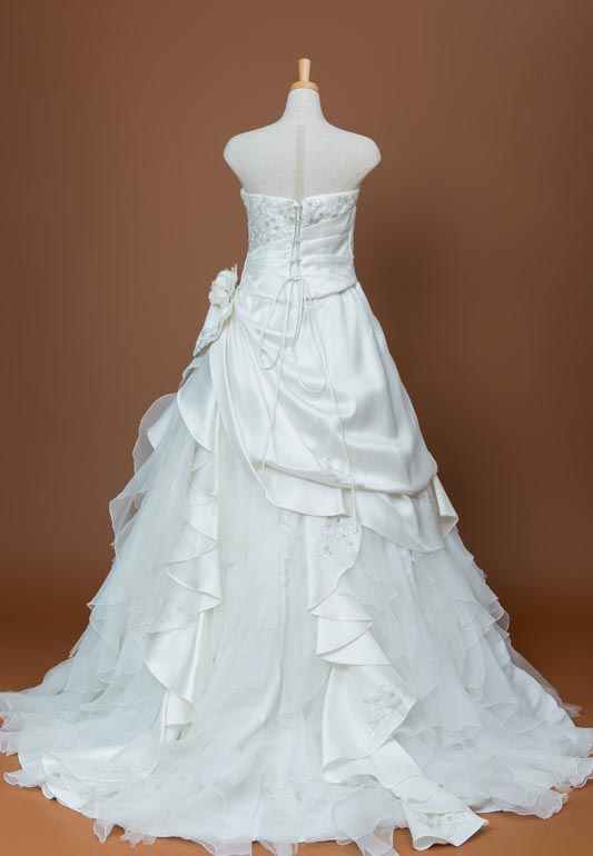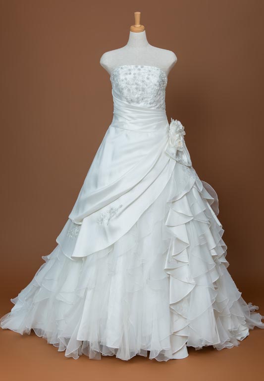 - アシンメトリーなスカートのドレープの下に現れる流れるようなフリルがエレガントで華やかな曲線を描き、ゴージャスで主役にふさわしいドレスを作り上げています。