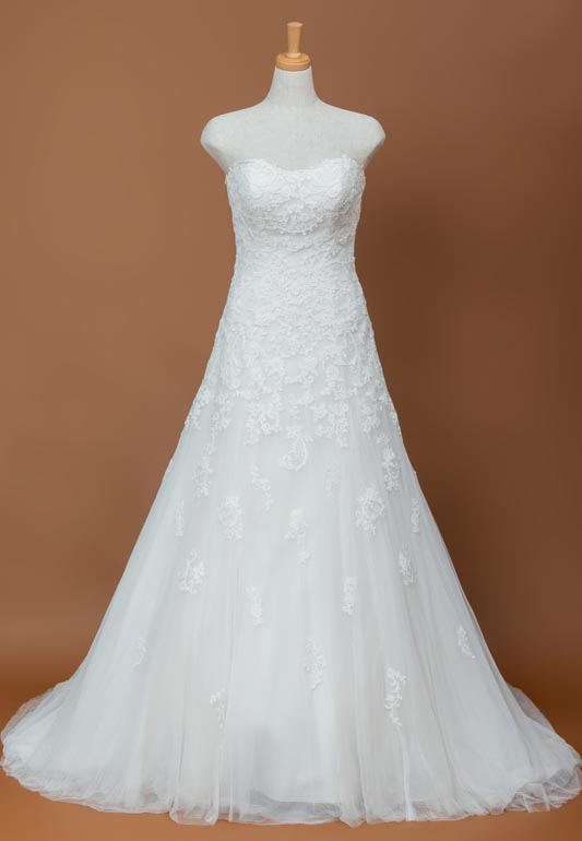- 裾にチュールでフレアーをとった、細身のフィット&フレアーのシルエットはレストランなどの会場でも動きやすく、それでいて華やかさも感じさせてくれます。マーメイドに憧れはあるけど抵抗があるような方にもおすすめのドレスです。