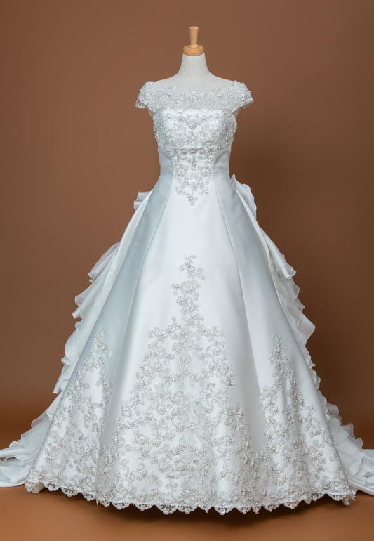 - ミカド生地にたっぷりの金糸のレースを纏った主役感のある、華やかAラインドレス。ビスチェとオフショルダーの2wayはもちろん、華やかなロングトレーンも着脱が可能。長いバージンロードではオーガンジーのフリルトレーンが華やかかつ大胆で、ゲストの印象に残る事間違いなし!