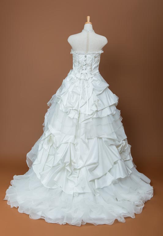 - ボリュームたっぷりな15号から19号のAラインのティアードドレス。こちらのドレスはトップス部分のヨークが取り外し可能なドレスです。 2通りの雰囲気を楽しむことができるのでお色直しをしない方にもおすすめの1着。