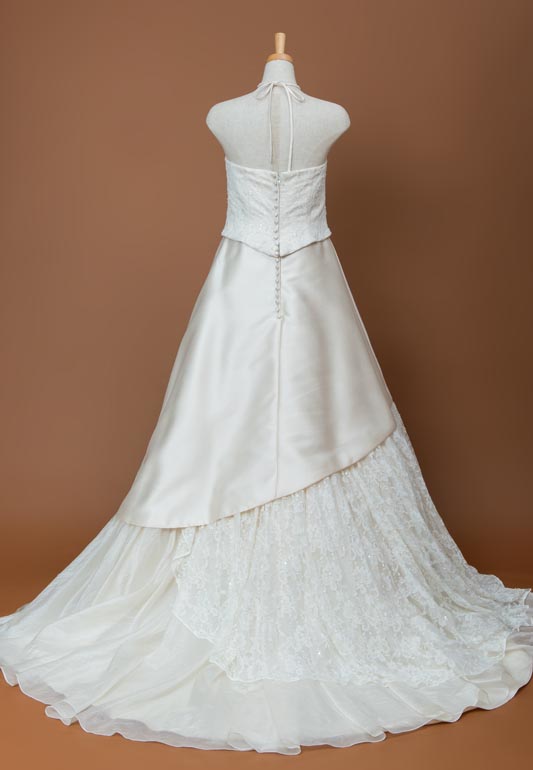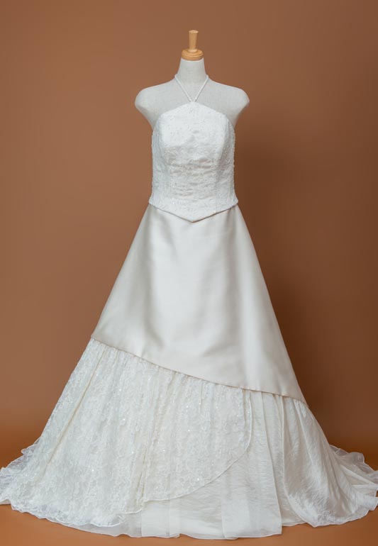 - サテン生地を使用したクラシカル上品なAラインドレスです。上半身にはエンブロイダリーレースがあしらってあり、さりげなく豪華さもプラスされています。ホルタ―ネックのストラップも有る事で上半身がコンパクトに見えスタイルアップ効果もございます。